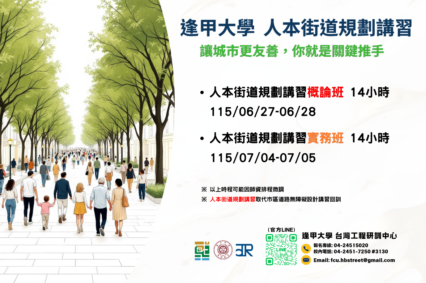 115.04.09 檢送逢甲大學台灣工程研訓中心辦理「人本街道規劃講習」及 「公共工程品質管理回訓班」招生簡章與優惠資訊 DM1 (15 下載數) DM2 (14 下載數) 逢甲大學 函 (21 下載數) 附加資訊 來文單位: 逢甲大學 發文日期: 2026-04-08 發佈於 活動訊息 此分類更多內容: « 115.04.02 財團法人中國生產力中心 檢送「2026臺北設計獎」參賽辦法如附件,本會協助公告會員周知。 115.04.15 財團法人臺灣營建研究院訂於115年5月28日(四)上午8:30~12:00辦理「2026工程履約爭議研討會」 » 返回頂部
